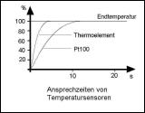 Grundsätzlich kann man sagen, daß Thermoelemente schneller als Pt100-Widerstandsthermometer die Meßstellentemperatur erfassen. Dafür sind mit Pt100-Widerstandsthermometer in der Regel genauere Messungen möglich. Die Ansprechzeit wird üblicherweise durch die Zeitangabe t99, t95 oder t63 angegeben. t99 (t95 bzw. t63) ist die Zeitspanne die der Sensor benötigt, um 99% (95% bzw. 63%) der "Meß-Endtemperatur" zu erfassen. Ansprechzeiten von Temperatursensoren sind von verschiedenen Faktoren abhängig und nicht unter allen erdenklichen Einsatzbedingungen gleich zu bewerten! Bei mawi-therm werden sie folgendermaßen ermittelt: ● Luftfühler => im Windkanal bei 2m/s bei 60°C ● Tauch-/Einstechfühler => in bewegter Flüssigkeit bei 60°C ● Oberflächenfühler => auf einer homogen temperierten Metalloberfläche bei 100°C