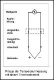 Die Temperaturmessung in Verbindung mit Thermoelementen basiert auf einer Temperatur-Vergleichsmessung zwischen Meßstelle und einer Vergleichsstelle. Ein Thermoelement besteht aus zwei punktförmig verschweißten Drähten verschiedener Materialien bzw. Metallegierungen. Erwärmt man die Verbindungsstelle - auch Meßstelle oder "Heißlötstelle" genannt - so entsteht an den freien Enden eine Spannung (Thermospannung "EMK"). Die Größe dieser Spannung hängt von den verwendeten Materialien ab. Die freien Enden werden über spezielle Leitungen, sogenannte Ausgleichsleitungen, bis zu einer Vergleichstelle (Zone bekannter und konstanter Temperatur) verlängert. Ausgleichsleitungen besitzen bis zu einer Temperatur von 200°C die gleichen thermoelektrischen Eigenschaften wie das Thermoelement selbst, so daß keine zusätzliche Spannung erzeugt wird. Aus der Vielzahl der möglichen Thermopaare wurden bestimmte Materialkombinationen ausgesucht und als genormte Thermopaare in der DIN EN60584-1 bzw. der IEC 584-1 festgelegt.