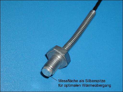Die sehr gut wärmeleitende Silberspitze der Schraube ermöglicht eine vergleichsweise kurze Ansprechzeit.Durch die Position des Meßwiderstandes in der Schraube und den guten Wärmeübergang durch die Ag-Spitze ist der Sensor auch als Oberflächenfühler gut geeignet. |