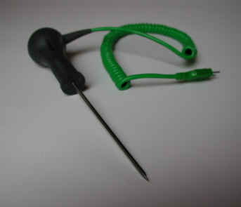 Mantelthermoelement mit Handgriff und PVC-Ausgleichsleitung sowie angeschlossenem Miniaturstecker (Bauart SM-K-S) zum Anschluß an Anzeigegeräte.