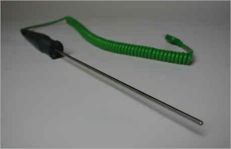 Mantelthermoelement mit Handgriff und PVC-Ausgleichsleitung sowie angeschlossenem Miniaturstecker (Bauart SM-K-S) zum Anschluß an Anzeigegeräte. |