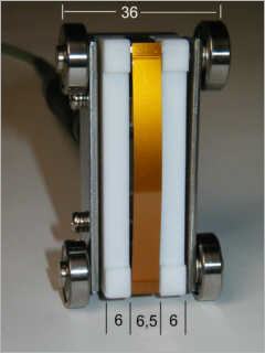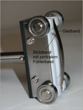 Besonderheiten: Gemessen wird mit einem Fühlerbändchen aus Thermomaterial, welches sowohl eine außerordentlich hohe Grundgenauigkeit sowie m.H. eines Stützbandes ausgezeichnete mechanische Eigenschaften aufweist. Durch Verwendung eines Gleitbandes mit einer speziellen Oberflächenbeschichtung ergeben sich optimale Gleiteigenschaften und somit eine minimale Reibung bei bewegten Oberflächen. Teflonklötze zwischen den Rollenachsen verhindern ein Durchknicken des Bandes.Der Fühler ist extrem genau, sehr schnell ansprechend und dabei doch äußerst robust.Ein ggf. defektes Fühlerbändchen kann ersetzt werden!