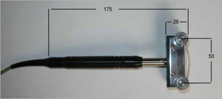 allg. Beschreibung: Oberflächenfühler mit Handgriff und Silikon-Ausgleichsleitung sowie angeschlossenem Miniaturstecker (Bauart SM-K-S) zum Anschluß an Anzeigegeräte. Das Aufsetzen auf die sich ggf. bewegende Oberfläche wird mit Hilfe von vier kugelgelagerten Laufrollen bewerkstelligt.