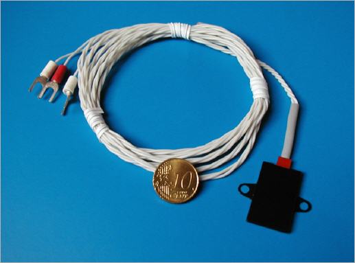 Der Messwiderstand ist durch eine Silikonhülle mechanisch gedämpft in einem robusten Messinggehäuse untergebracht mit zwei Ösen zur Befestigung.