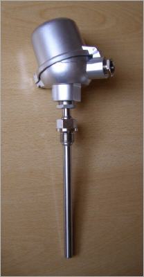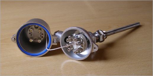 robuster Einschraubfühler mit 3-fach Messeinsatz Pt100 und entsprechendem Anschlußkopf zum 4-Leiter-Anschluß aller 3 Einzelsensoren. |